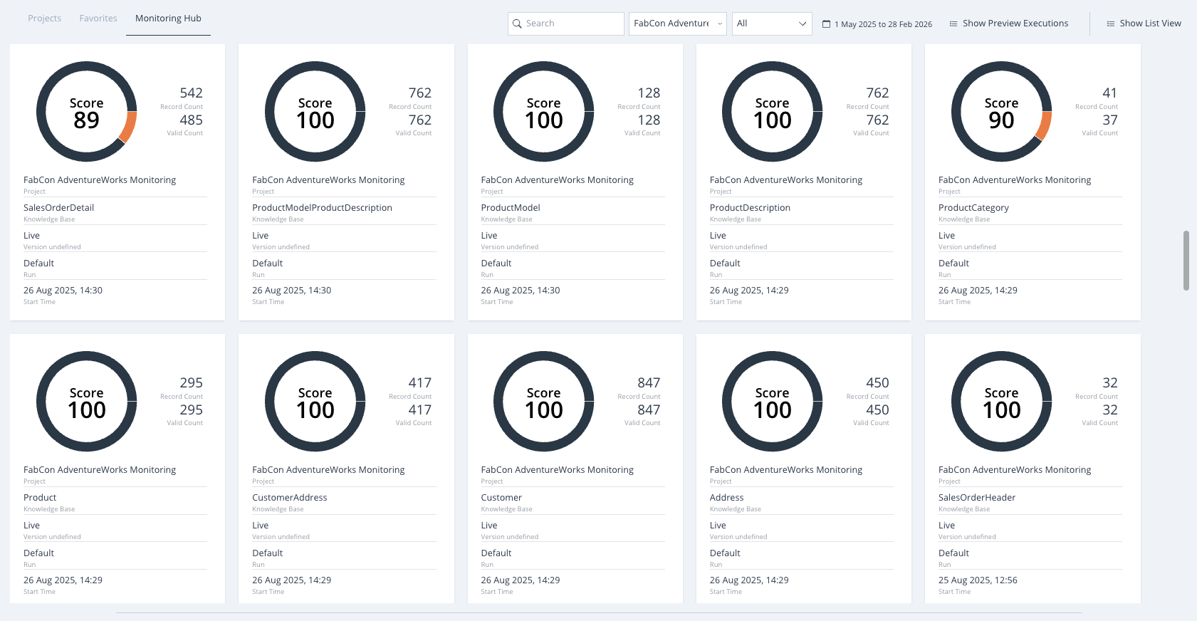The Monitoring Hub is a centralized dashboard showing recent Run Executions from all monitored Runs across all Projects. Add your critical production Runs once and you have a single place to check pipeline health - without navigating into each Knowledge Base individually.